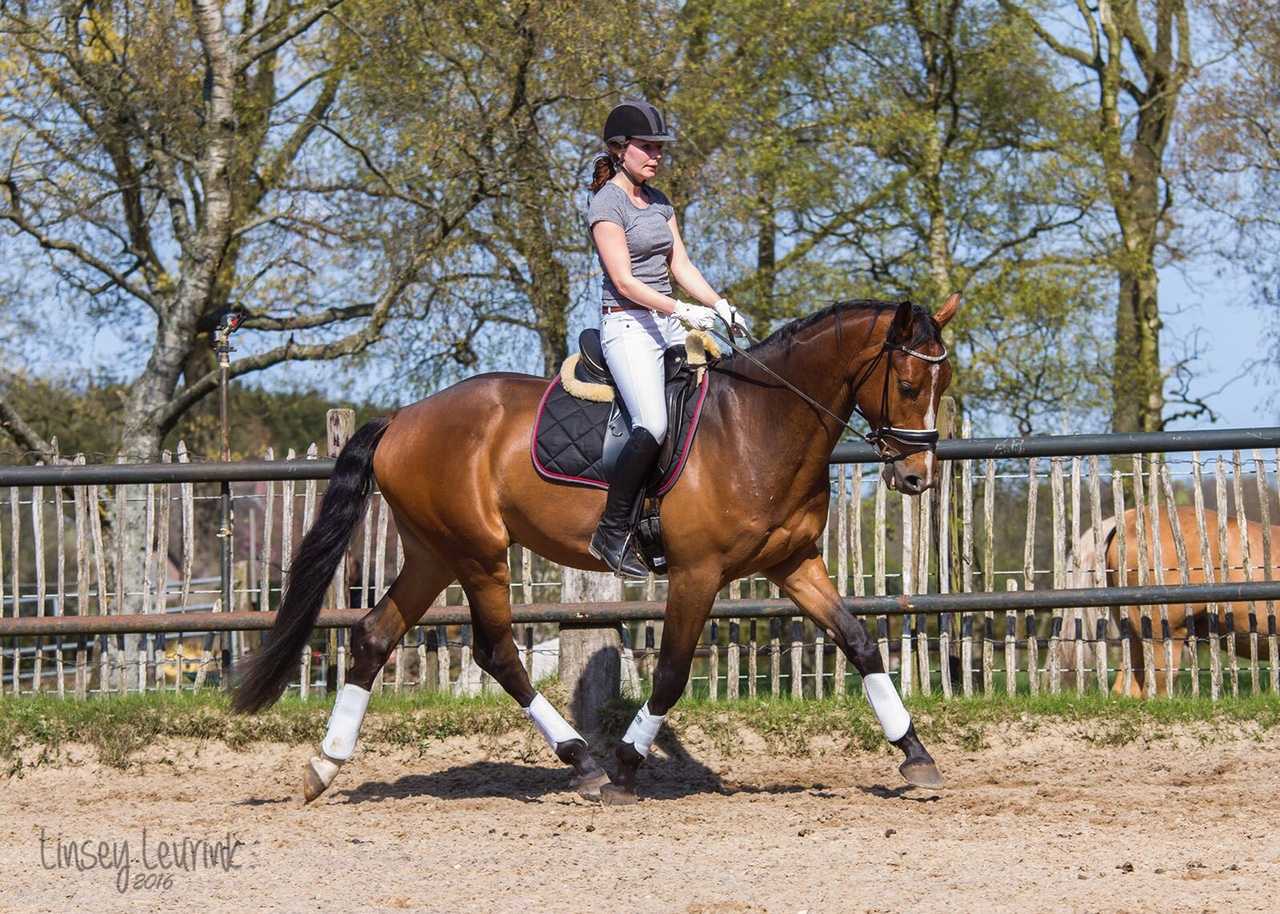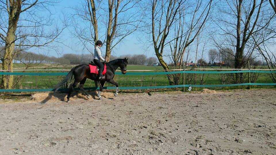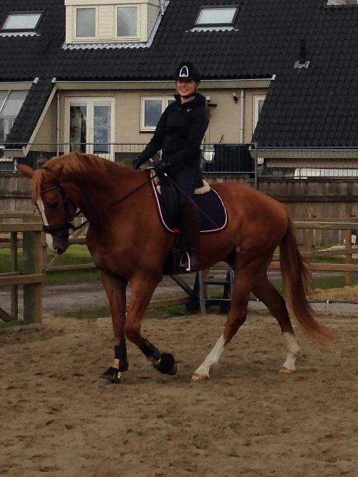 Graag wil ik je hierbij laten weten dat Hands Up (oftewel Hup haha) het heel erg fijn doet! Toen ik m'n vorige merrie weg deed omdat ik de klik totaal miste was ik opzoek naar een écht maatje voor het leven. Een betrouwbare jonge brave ruin met 3 goede gangen en eentje die in de omgang schaapmak is. Nou, hij voldoet volledig en nu na 7 weken zijn we al behoorlijk maatjes geworden en komt die soms zelf al vrolijk naar me toe gedraafd als ik hem uit de wei haal. Je verkoopt gezonde fijne brave paarden en dat je niet op mijn merrie wou inruilen omdat ze heet en sensibel is zegt al genoeg. Als je een goed gezond paard wilt met een fijn braaf karakter maar wel de potentie heeft voor de sport moet je bij jou zijn. Ook tijdens het proefrijden heb je mij fijn geholpen en toen ik je mening vroeg gaf je eerlijk antwoord. En je hebt het dus goed ingeschat, hij past absoluut bij me en voldoet aan al mijn eisen. Ondanks zijn jonge leeftijd is hij bijzonder makkelijk en laat hij zich fijn bewerken waardoor ik hem nog geheel naar eigen hand kan zetten. In het najaar gaan we lekker starten in de B dressuur! Heel erg bedankt voor je bemiddeling en voor dit fijne paard!